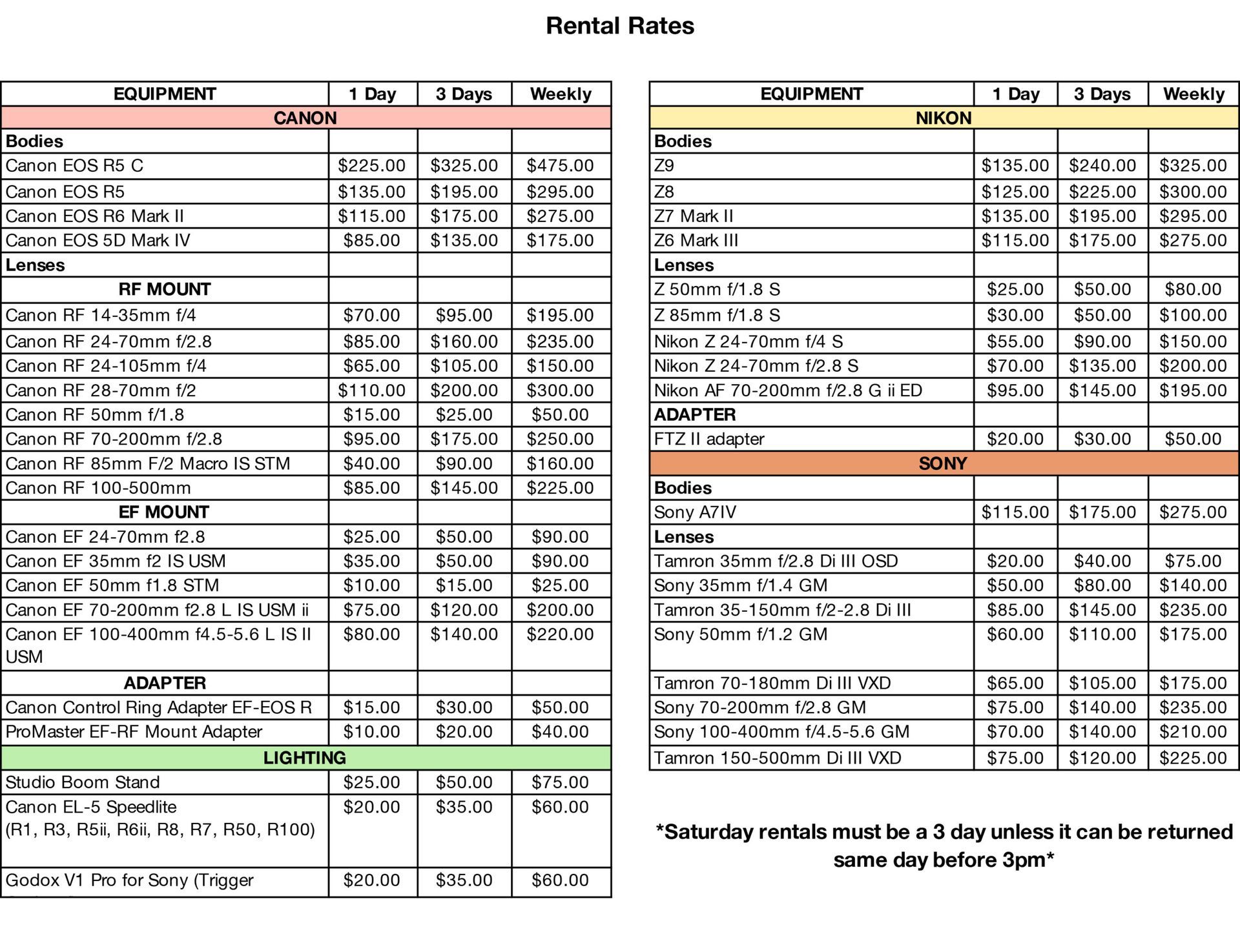 A valid driver’s license or ID and credit card are required to rent equipment form Armadillo Camera, as well as signed rental agreement.